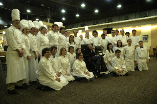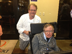 Stephen Hawking with Tom (left) and a Cooking 101 class (right). (Photos courtesy of Tom Mannion.)