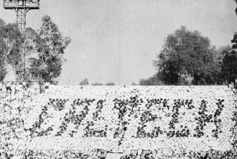 When the cheerleaders had again left their residence a few days later, members of the Fiendish Fourteen broke in once more. This time, they collected the master instruction sheet and modified parts of it to produce 2232 individual instruction cards. The Techers planted the cards in the cheerleaders’ room and awaited for their plan to execute on its own. The prank went fantastically well. At half time, the card displayers went through the first eleven designs as intended by its original creator. Then, aberrations started to emerge. What was supposed to be the Husky mascot looked a lot like a beaver. The word “Washington” was shown backwards. At last, the unmistakable name “CALTECH” was spelled out, for all 30 million viewers at home to behold.