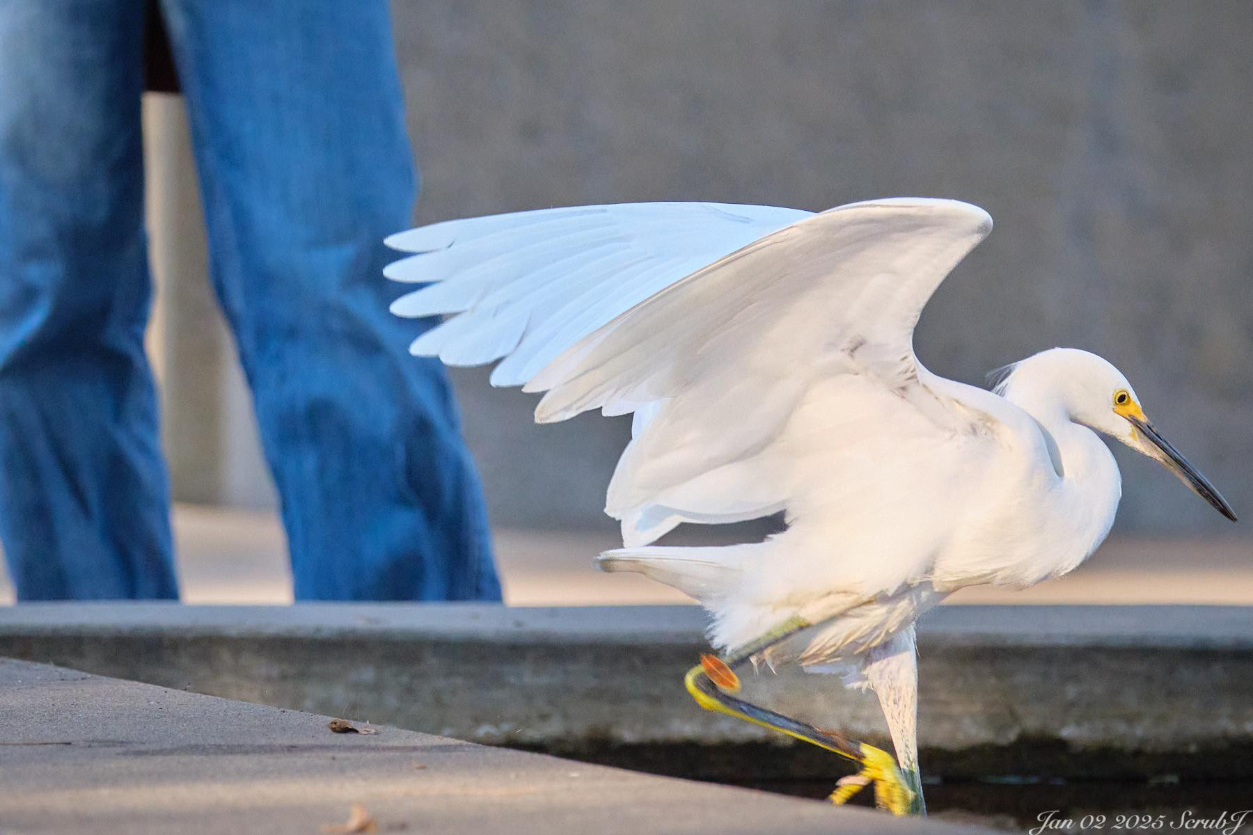 The snowy egret hopped into the lily pond under the stare of a Caltech student.