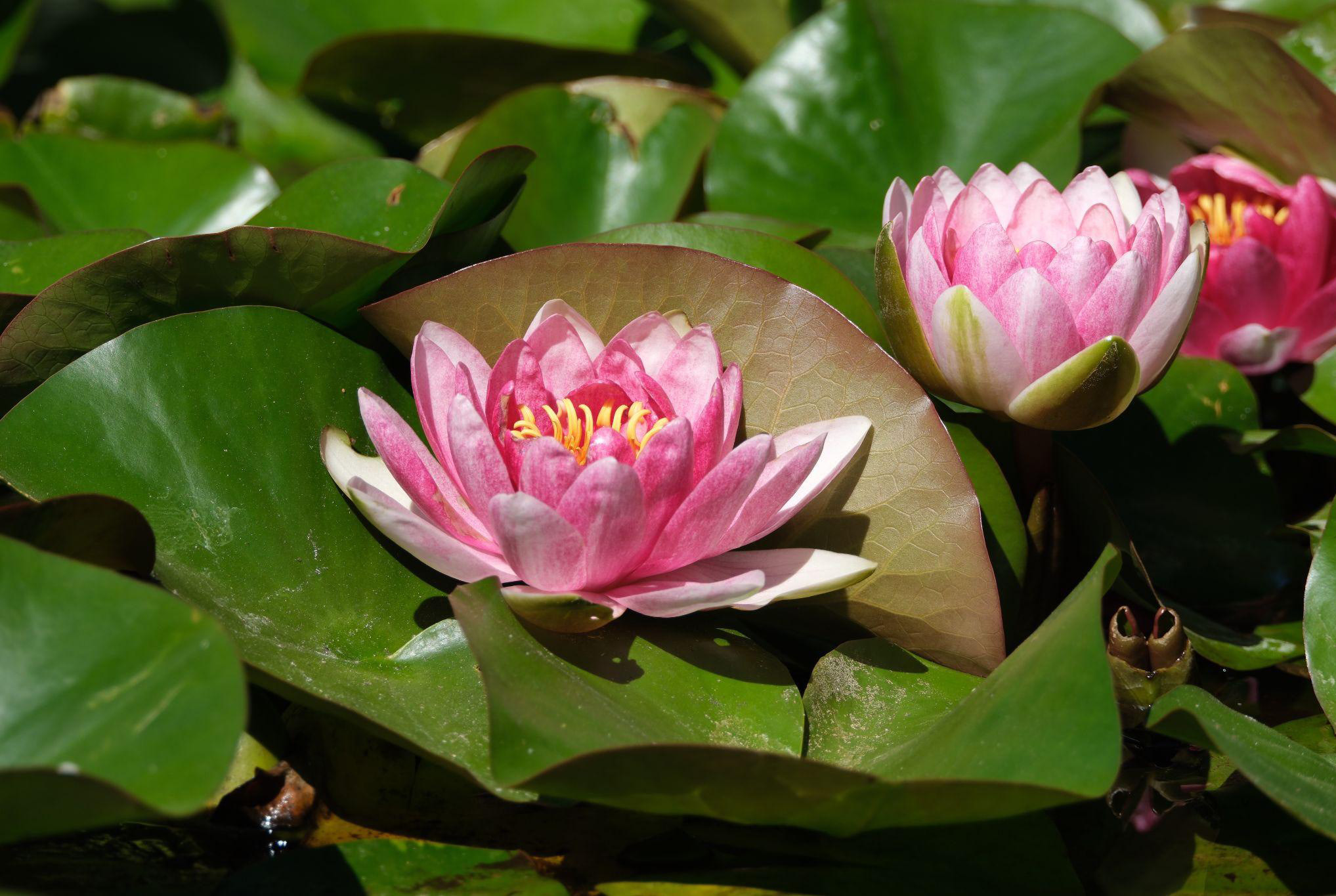 Pink water lilies that will soon bloom in the Spring term.