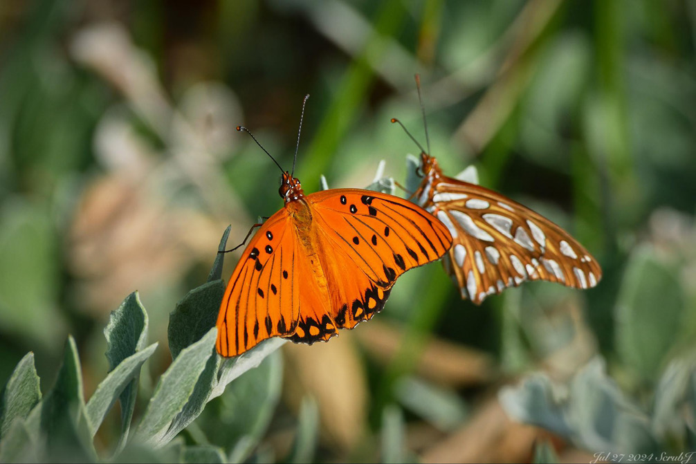 A pair of gulf fritillaries showing you a contrast of their dorsal and ventral views.